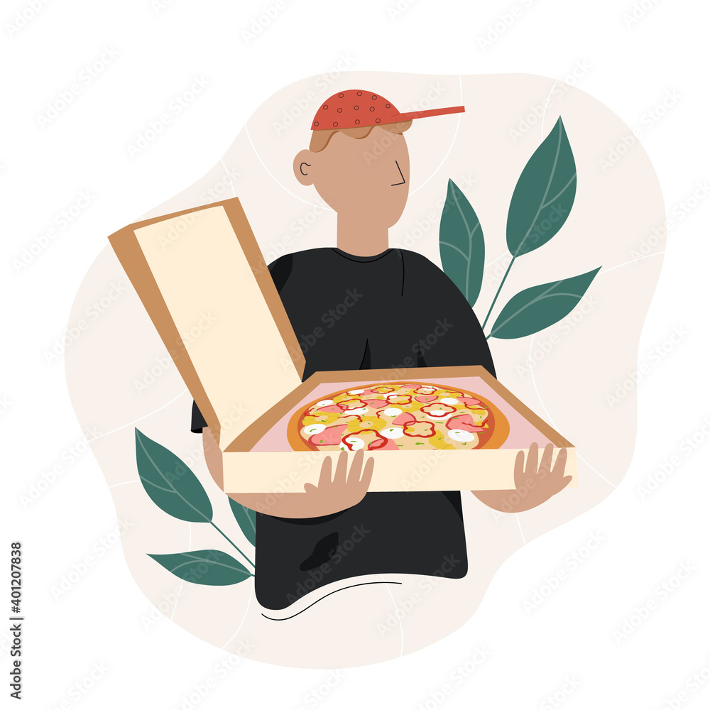 Pizza Delivery Man With Tasty Pizza Fast Food Delivery Flat Illustration Stock Illustration Adobe Stock